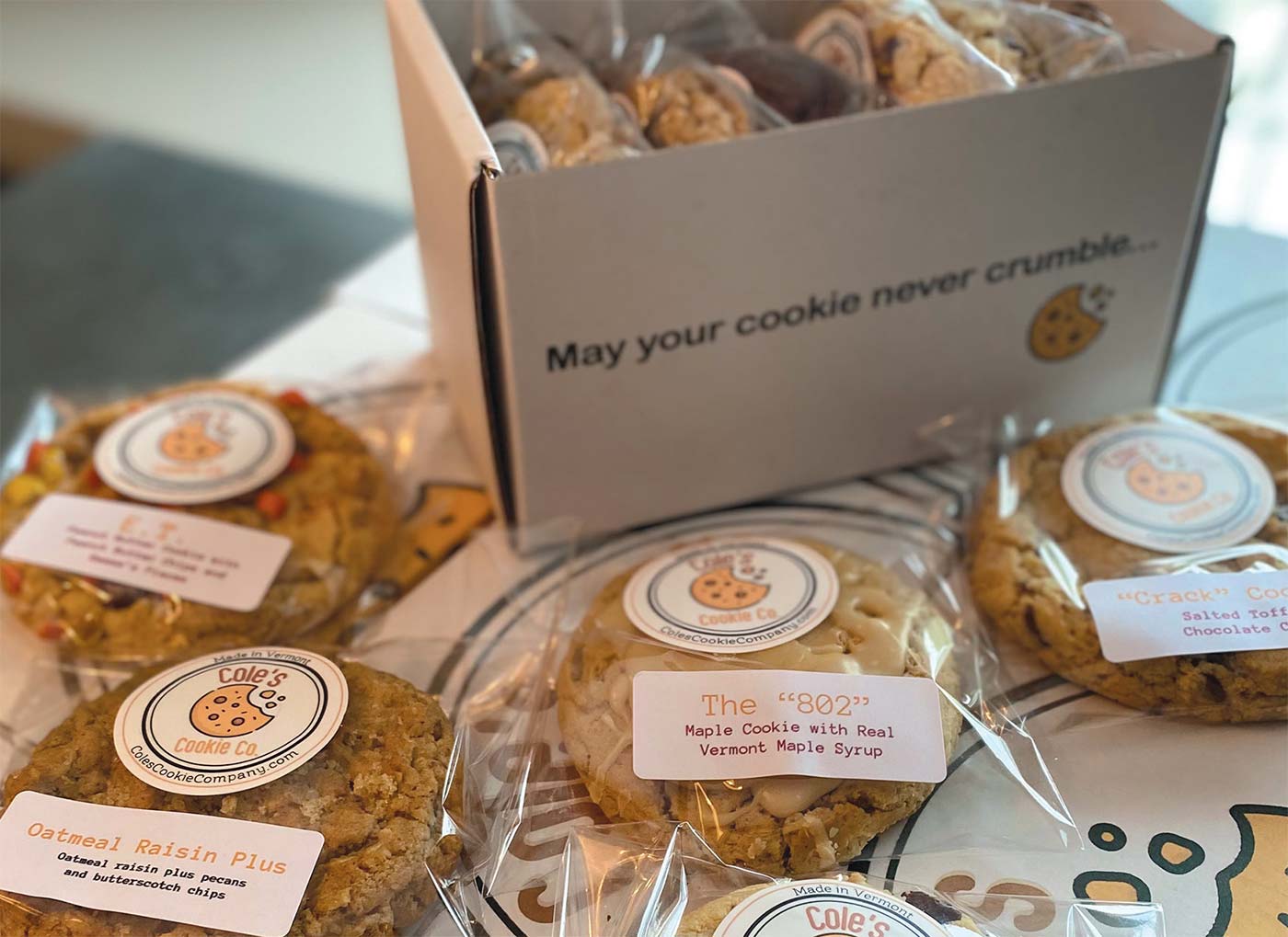 A small sampling of her scrumptious cookie business includes The “802,” a maple cookie with Vermont maple syrup, and “Crack” cookie, with salted toffee and chocolate chips. It was the first one she created, named by her young nephew and currently her only cookie helper. Her Chocolate Chip cookie made with the recipe passed down by her grandmother is sentimental, bringing back fond childhood memories in her “memere’s” kitchen. With 16 different flavors, her creative ingredients, post-baking decorating, and the numerous renditions to get it just right, her cookies seriously rock.